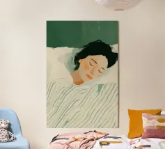 This contemporary illustration captures a quiet evening moment, where rest and introspection gently unfold. The relaxed figure resting on the bed, wrapped in soft textiles and muted tones, evokes comfort, solitude, and emotional calm. Layered brush textures, subtle patterns, and a balanced composition create a sense of warmth and safety. The artwork blends modern abstraction with narrative softness, making it ideal for cozy interiors, lifestyle editorials, or fine art prints celebrating slow evenings and personal space.