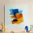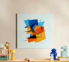 This dynamic, abstract painting is an energetic composition of overlapping geometric shapes such as rectangles, triangles and a central circle. The colour palette is intense and rich in contrast, dominated by warm tones such as bright orange and yellow, set against cool blue tones (light and dark blue). The shapes appear partly transparent and are framed by rough brushstrokes. Fine black lines, reminiscent of speed, run through the composition. The work combines elements of constructivism with expressive gestures.