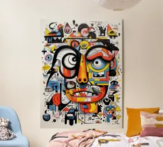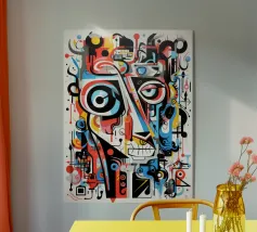 Vivida illustrazione astratta di un volto umano resa con pennellate audaci e vibranti spruzzi di rosso, blu, giallo e nero. I dettagli espressivi evocano emozioni e creatività, fondendo arte moderna e realismo.