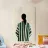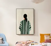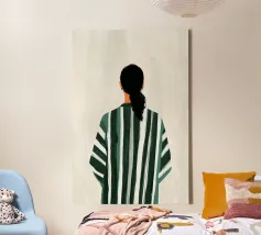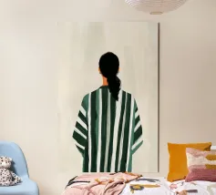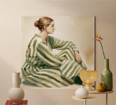 Questa opera d'arte mostra una figura solitaria vista di spalle, vestita con un abito verde a strisce morbide su uno sfondo chiaro e strutturato. La composizione semplice e i colori tenui creano un senso di calma, distanza e riflessione. L'attenzione alla postura piuttosto che all'espressione invita lo spettatore a proiettare i propri pensieri ed emozioni. Un'opera moderna e sobria che porta quiete, equilibrio e presenza silenziosa negli interni contemporanei.