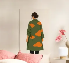 This artwork shows a solitary figure seen from behind, dressed in a softly striped green garment against a light, textured background. The simple composition and muted colors create a sense of calm, distance, and reflection. The focus on posture rather than expression invites the viewer to project their own thoughts and emotions. A modern, understated piece that brings stillness, balance, and quiet presence into contemporary interiors.