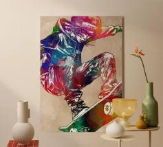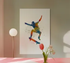 Un'illustrazione dinamica e colorata in stile schizzo di una ragazza impavida in movimento su uno skateboard. Audaci linee di inchiostro incontrano vivaci schizzi di acquerello in rosa, verde, arancione e giallo, catturando l'energia, la libertà e lo spirito della gioventù. Lo sfondo minimalista contrasta splendidamente con il movimento espressivo della figura. Perfetto per interni moderni, camere di ragazzi, amanti dello skate o studi creativi alla ricerca di un tocco di colore e attitudine urbana.