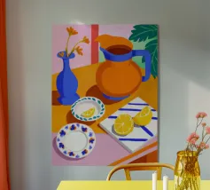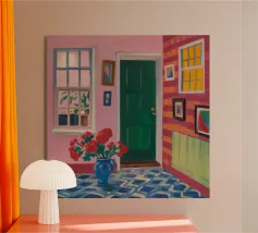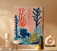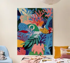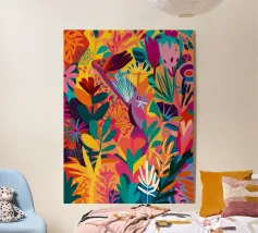Una composizione astratta alta e stretta, piena di forme e motivi di foglie colorate sovrapposte, che suggerisce una fetta vibrante di una fitta giungla verticale.