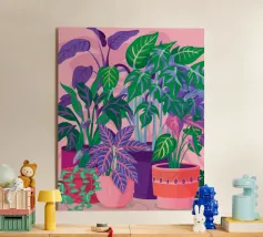 Una composizione astratta alta e stretta, piena di forme e motivi di foglie colorate sovrapposte, che suggerisce una fetta vibrante di una fitta giungla verticale.