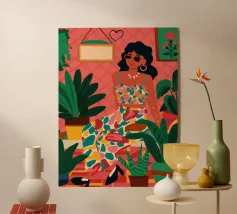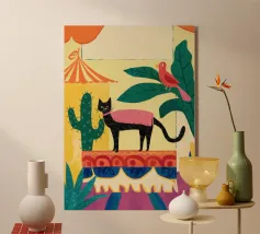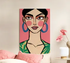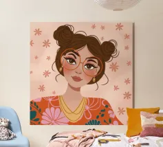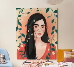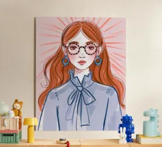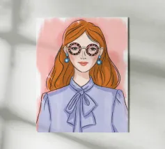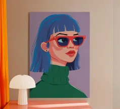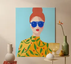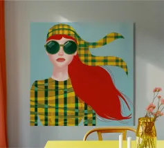 Questo vivace ritratto pop art presenta una rossa sicura di sé che indossa audaci occhiali verdi da gatta e un dolcevita giallo. Il mix di elementi retrò e moderni crea una divertente dichiarazione di intelligenza, stile e impavida individualità.