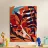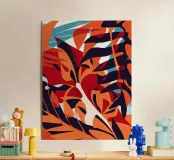 An abstract composition of tropical leaves in fiery shades of red, orange, and black creates a passionate, energetic, and bold botanical artwork.