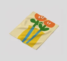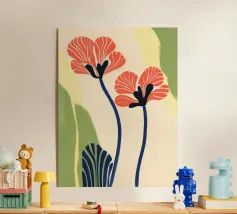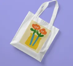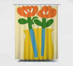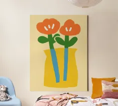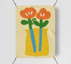 Fiori dai colori vivaci con petali arancioni e foglie verdi si trovano in un vaso giallo su uno sfondo neutro. Il design semplice e deciso utilizza forme piatte e colori vivaci per creare un'estetica allegra e moderna.
