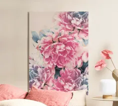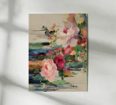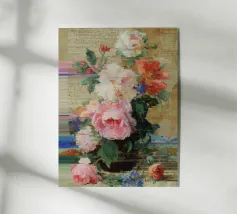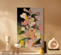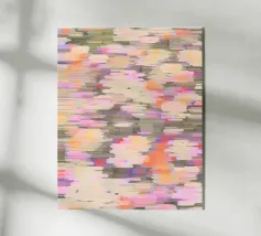Questa vibrante arte digitale astratta combina colori brillanti e texture glitterate ispirate a motivi botanici. Le strisce orizzontali in rosa, arancione, blu e verde portano nuova energia in ogni spazio abitativo e celebrano la bellezza della natura colorata.