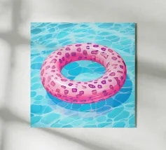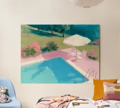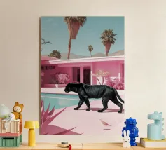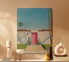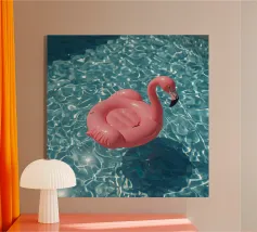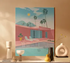 Una scena nostalgica di Palm Springs: un fenicottero rosa che nuota alla deriva in una piscina turchese, incorniciata da morbidi lettini pastello e palme svettanti. Quest'opera d'arte conferisce uno spirito estivo retrò, un'atmosfera vacanziera rilassata e un fascino di metà secolo a qualsiasi parete, ideale per soggiorni, camere da letto o per un arredamento elegante a bordo piscina.