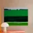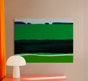A series of layered greens and dark tones suggest a minimalist landscape. The composition evokes a sense of tranquility with horizontal bands that mimic fields and distant hills.