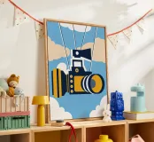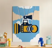 A stylized illustration of a camera suspended in the sky, perfect for photography-related designs.