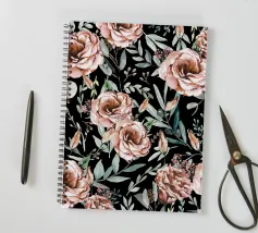Motivo scuro di fiori acquerellati rosa, foglie di eucalipto e sfondo nero