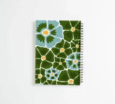 Un motivo di fiori stilizzati presenta grandi petali verdi e piccoli petali azzurri, ciascuno con un centro giallo. Il disegno è astratto e ripetitivo e trasmette un'estetica audace e moderna.
