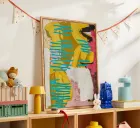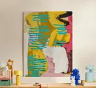 Un'audace pittura astratta caratterizzata da ampie aree di turchese e giallo brillante, contrastate da forme e linee bianche e nere, che suggeriscono una collisione dinamica o un flusso di forze elementari.