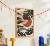 Foglie di Monstera tropicale con calde forme astratte di sole plexiglass