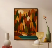 Una scena di foresta stilizzata e armoniosa con fiume, ricca di calde tonalità autunnali in un effetto legno con legni colorati. (Una miscela di forme geometriche e curve morbide per formare gli alberi, ciascuno con una combinazione unica di colori come l'arancione bruciato, il verde intenso, il giallo oro e il marrone terroso. Questi colori si fondono magnificamente, evocando la sensazione dell'autunno, quando la tavolozza della natura è al suo massimo splendore.