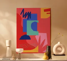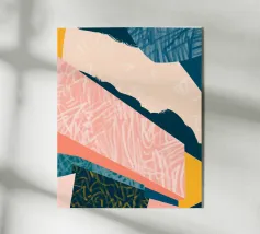 Forme geometriche audaci in blu, giallo e rosa contrastano con uno sfondo neutro. Ombre organiche e punti colorati creano una composizione dinamica e astratta.
