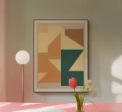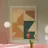 Un'opera d'arte geometrica astratta con forme decise nei toni dell'arancione, del verde e del beige, disposte su uno sfondo chiaro e strutturato con un bordo incorniciato.