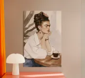 Boho drawing painting by Frida Kahlo she sits relaxing with a cup of coffee in a coffee surrounded by floral foliage and earthy tones that create a warm and inviting atmosphere.