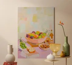 A bowl of fruit glows under sunlit shadows on a rustic table, evoking cozy stillness and domestic charm.
