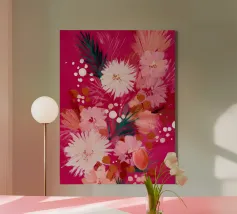 Rosa e bianco vibranti danzano insieme in un bouquet audace e festoso. Questo energico quadro floreale porta subito allegria, ideale per le decorazioni natalizie o per celebrare il colore tutto l'anno.