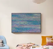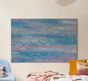 This image features an abstract pattern with a multitude of colorful dots arranged in wavy lines across a gradient background that transitions from shades of blue at the top to lighter hues towards the bottom. The waves undulate rhythmically, creating a sense of movement reminiscent of rippling water or rolling hills. Each dot is outlined with white, adding contrast and highlighting the meticulous detail within the pattern. The overall effect is playful and vibrant, evoking a cheerful atmosphere through its use of color and form.