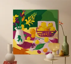 Un'opera d'arte astratta vibrante ed espressiva con una fusione di colori audaci di ispirazione fauvista come il magenta, l'arancione e il nero. Le pennellate e le forme energiche creano un'opera dinamica e appassionata.