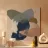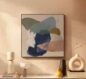 An abstract painting with soft, overlapping organic shapes in muted tones of olive green, dusty blue, and beige, with a grounding dark accent, creating a calm, earthy feel.