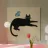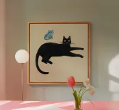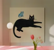 Un'illustrazione semplice e minimalista di un grande gatto nero sdraiato con un piccolo topo blu seduto sulla schiena. Lo stile è affascinante e pulito.