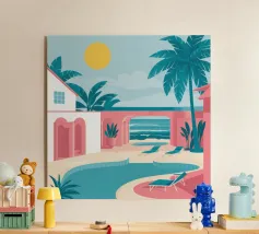 Un gatto bianco e nero siede regalmente dietro un grande vaso di fiori con motivi a strisce vivaci, sullo sfondo di una tenda rosa, creando una natura morta suggestiva e affascinante.