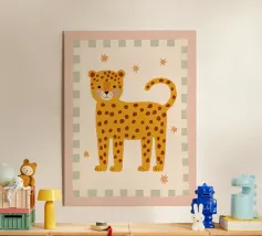 A sweet and softly detailed leopard sits calmly against a warm beige background, surrounded by muted botanical leaves in sage green and soft terracotta tones. With delicate spotted fur, rosy cheeks, and a gentle expression, this charming illustration brings a cozy and comforting feeling to any nursery or child’s room.