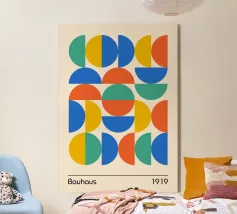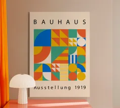 A colourful poster in the style of modern Bauhaus design. Clear shapes, vibrant primary colours and a balanced composition make this motif an eye-catcher in any modern living or working space. Ideal for lovers of geometric art.