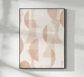 Il disegno presenta un'accattivante disposizione di cerchi, rettangoli e forme astratte di foglie sovrapposte, che alludono sottilmente a forme organiche all'interno della struttura. La texture granulosa aggiunge profondità e interesse visivo.