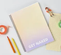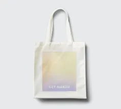 "GET NAKED" in caratteri bianchi su un morbido gradiente di colore, ispirato ai colori del tramonto. Design minimalista con sottili raggi di sole, estetica moderna e dettagli di alta qualità: chiaro, tranquillo ed elegante.