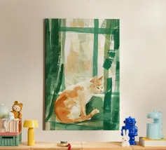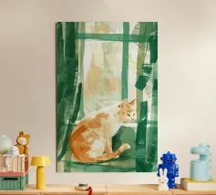 Un'illustrazione contemporanea e minimalista con un gatto rosso che riposa tranquillamente accanto a una finestra, circondato da pennellate verdi stratificate e morbide forme astratte. Lo stile pittorico espressivo e l'armoniosa tavolozza di colori evocano calma, contemplazione e connessione con la natura. Quest'opera d'arte fonde l'astrazione moderna con una narrazione delicata, rendendola perfetta per soggiorni, camere da letto, angoli di lettura, studi o pareti di gallerie moderne. Un'opera da parete ideale per gli amanti dei gatti e per gli appassionati di illustrazioni artistiche contemporanee.