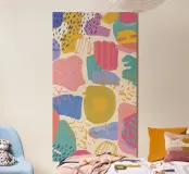 Un motivo astratto delicato e giocoso, composto da forme organiche morbide e colorate su uno sfondo chiaro, che crea un disegno rilassante e sottilmente strutturato.