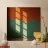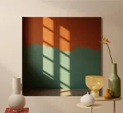 La calda luce del sole filtra da una finestra, proiettando ombre intricate su una parete vivace dipinta in arancione e blu-verde. I colori e le ombre contrastanti creano un'atmosfera serena.