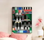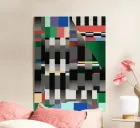 Bold geometric shapes dominate the composition, featuring a mix of colors and patterns such as stripes and checkered designs. The arrangement creates a vibrant and dynamic visual experience.