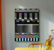 A digital pattern displays a series of geometric shapes with a variety of colors, resembling a TV test screen. Parallel lines and rectangles create a structured and vibrant composition.