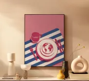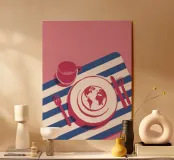 Un'illustrazione minimalista e concettuale di un singolo posto a tavola su una tovaglia a righe, con un mappamondo sul piatto. L'opera è una riflessione stimolante sulla cucina globale o sui viaggi.