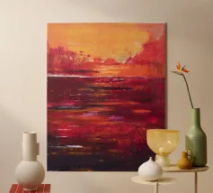 A vibrant abstract painting composed of rich, textured palette-knife strokes blending fiery yellows, oranges, and deep reds into dark crimson tones. The layered impasto surface creates a sense of movement and heat, evoking the energy of a glowing horizon or molten landscape. Bold color transitions and expressive brushwork make this a striking contemporary artwork with dramatic visual impact.