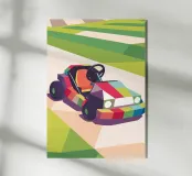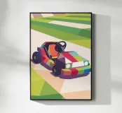 Illustrazione di un go-kart colorato su una pista con uno stile geometrico moderno.