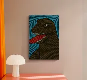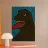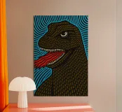Questo poster dalla grafica intensa presenta un ritratto stilizzato e ravvicinato di un gigantesco rettile (che ricorda Godzilla o un drago di Komodo). La pelle della creatura รจ resa con un disegno dettagliato e tattile di ovali marroni simili a squame su uno sfondo nero. La bocca aperta rivela denti bianchi e affilati e una spessa lingua rossa ondulata di fuoco o plasma. L'immagine รจ altamente dinamica, su uno sfondo di linee orizzontali blu vibranti e pulsanti, che le conferiscono una forte estetica psichedelica e da poster a luce nera. I contorni decisi e la tavolozza dei colori ad alto contrasto ne fanno un perfetto esempio di Pop Art.