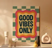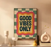 Un poster con citazioni di ispirazione vintage, con toni verdi e arancioni brillanti incorniciati da un bordo retrò ondulato. Progettato per portare positività e colore in qualsiasi spazio moderno.