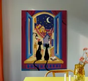 Two black cats sit silhouetted in an ornate, arched window, gazing out at a starry night sky with a full moon, creating a magical and gothic scene.