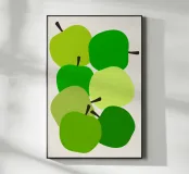Una vivace illustrazione di mele verdi in una gamma di tonalità fresche e vivaci. Perfetta per gli amanti della frutta e dell'arredamento della cucina. Questa opera d'arte giocosa ed elegante conferisce un tocco di naturalezza a qualsiasi spazio. Ideale per coloro che apprezzano l'audace semplicità della food art.