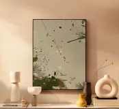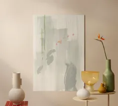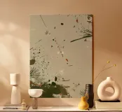 Sparse marks of green, sienna, and charcoal scatter across a pale surface, evoking pine needles, dust, and earth traces. The open composition and splattered texture suggest both movement and quiet space, like natural residue on wind-worn paper.