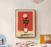 Semplice poster risograph con un fiore disegnato a mano che cresce da un vaso e la parola "Grow" in corsivo. Sfondo rosso e color crema, minimalista, dolce, senza ombreggiature, con linee chiare e realizzato come file vettoriale.