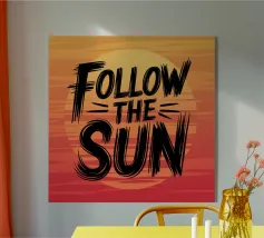 Un motivo solare in stile anni '70: un sole giallo splende in alto con raggi caldi in rosa, arancione e giallo, mentre sotto scorrono onde blu, con la scritta "GO WITH THE FLOW" in un vibrante giallo vintage. Le linee curve e la ricca palette di colori trasmettono leggerezza e una sensazione di spensieratezza estiva. Ottimismo, libertà e relax: un mantra visivo che invita a godersi il momento e ad abbandonarsi al ritmo naturale.