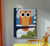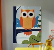 Godetevi la bellezza della natura invernale con questa illustrazione di un gufo appollaiato su un albero innevato. I colori vivaci e il design minimalista creano un'atmosfera incantevole e seducente.